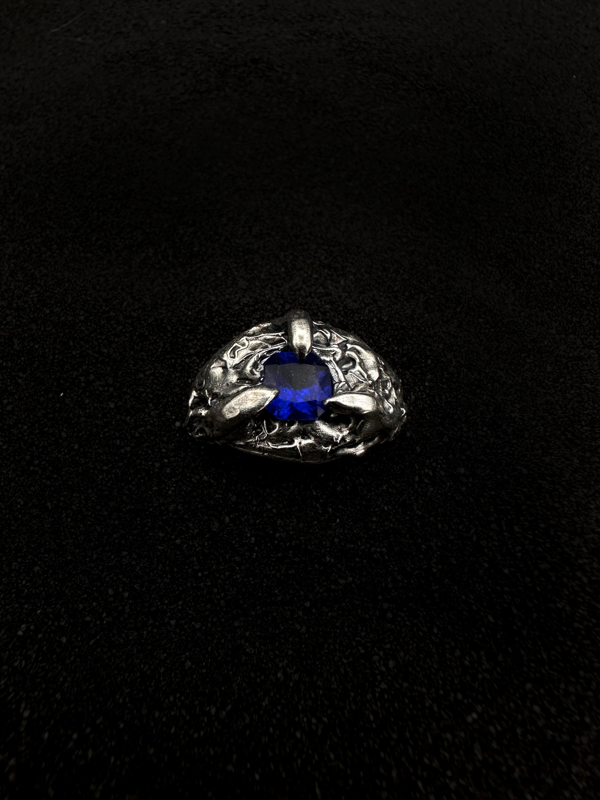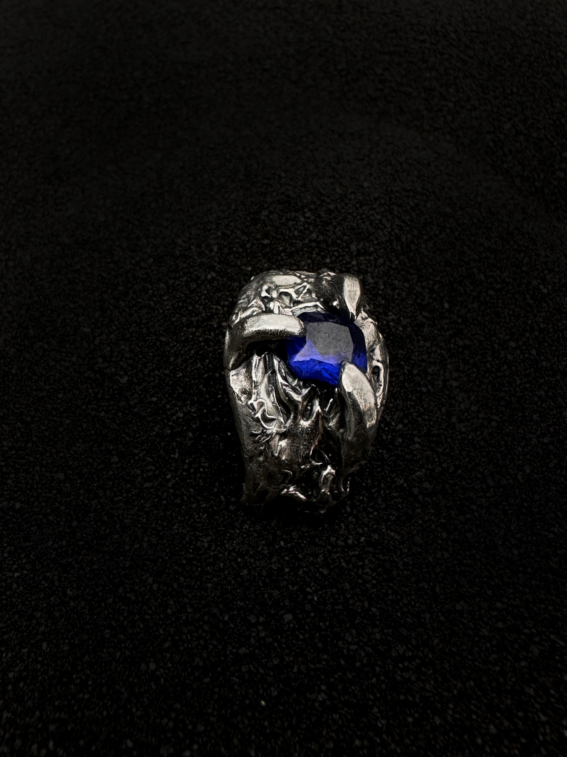 This organic-inspired sterling silver ring, crafted with the timeless lost wax technique, features flowing, natural lines that evoke the beauty of the wild. At its center rests a deep blue cubic zirconia, held securely by elegant claws, capturing both light and attention. The design’s freeform, earthy feel makes it a striking statement piece, blending raw beauty with refined craftsmanship.