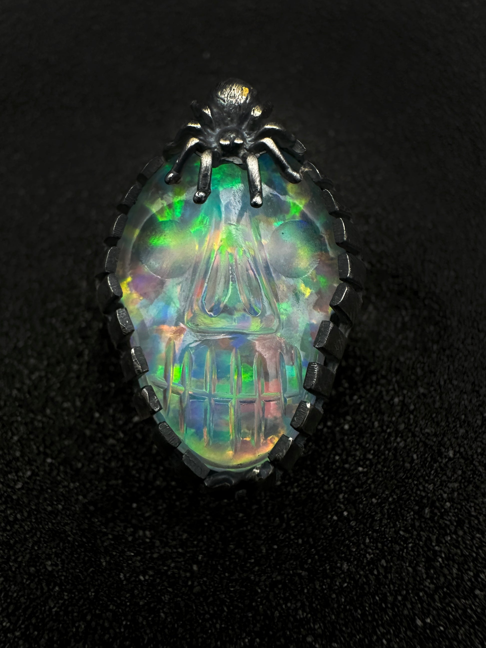 This sterling silver ring features a sculpted skull crowned with a small spider, symbolizing decay and quiet watchfulness. The band is cast from natural branches, giving the piece an organic, raw texture that feels grown rather than made.